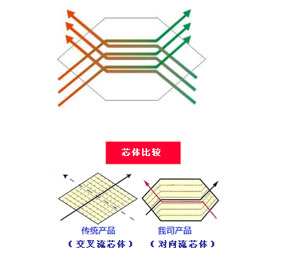 在交叉流芯體中,空氣進(jìn)行直線交叉,而在對(duì)向流芯體中,由于空氣長(zhǎng)時(shí)間在芯體中穿過(guò),因此,雖然進(jìn)行了薄形化,全熱交換效率反而有所提高。