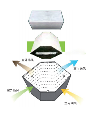 熱交換新風(fēng)機(jī)大多采用固定板翅式結(jié)構(gòu)熱交換核心,從室外引入的新風(fēng)和從室內(nèi)排出的回風(fēng)氣流呈交叉狀流經(jīng)熱交換芯體,但相互之間不直接接觸;冬季利用室內(nèi)排風(fēng)里的熱量加熱室外引入的低溫新風(fēng),夏季利用室內(nèi)排風(fēng)的冷量冷卻從室外引入的高溫新風(fēng)。